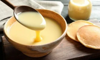 - برای خامه، خامه ترش را در ظرفی با همزن به مدت 2 دقیقه بزنید. سپس شیر تغلیظ شده را به تدریج اضافه کنید و هم بزنید.