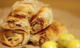- آلبالوها را روی نان پیتا بچینید و به شکل لوله درآورید و روی قالب قرار دهید.